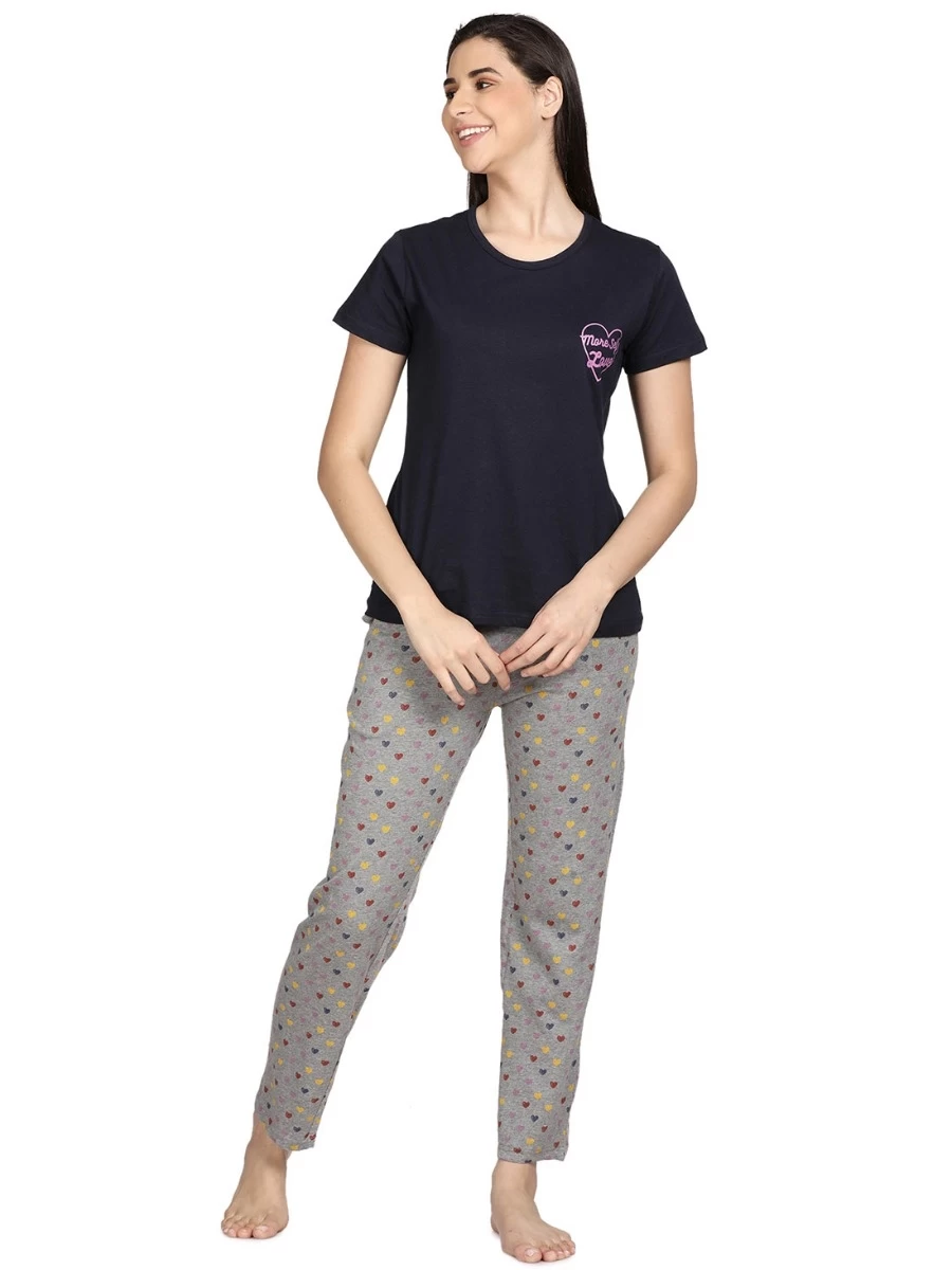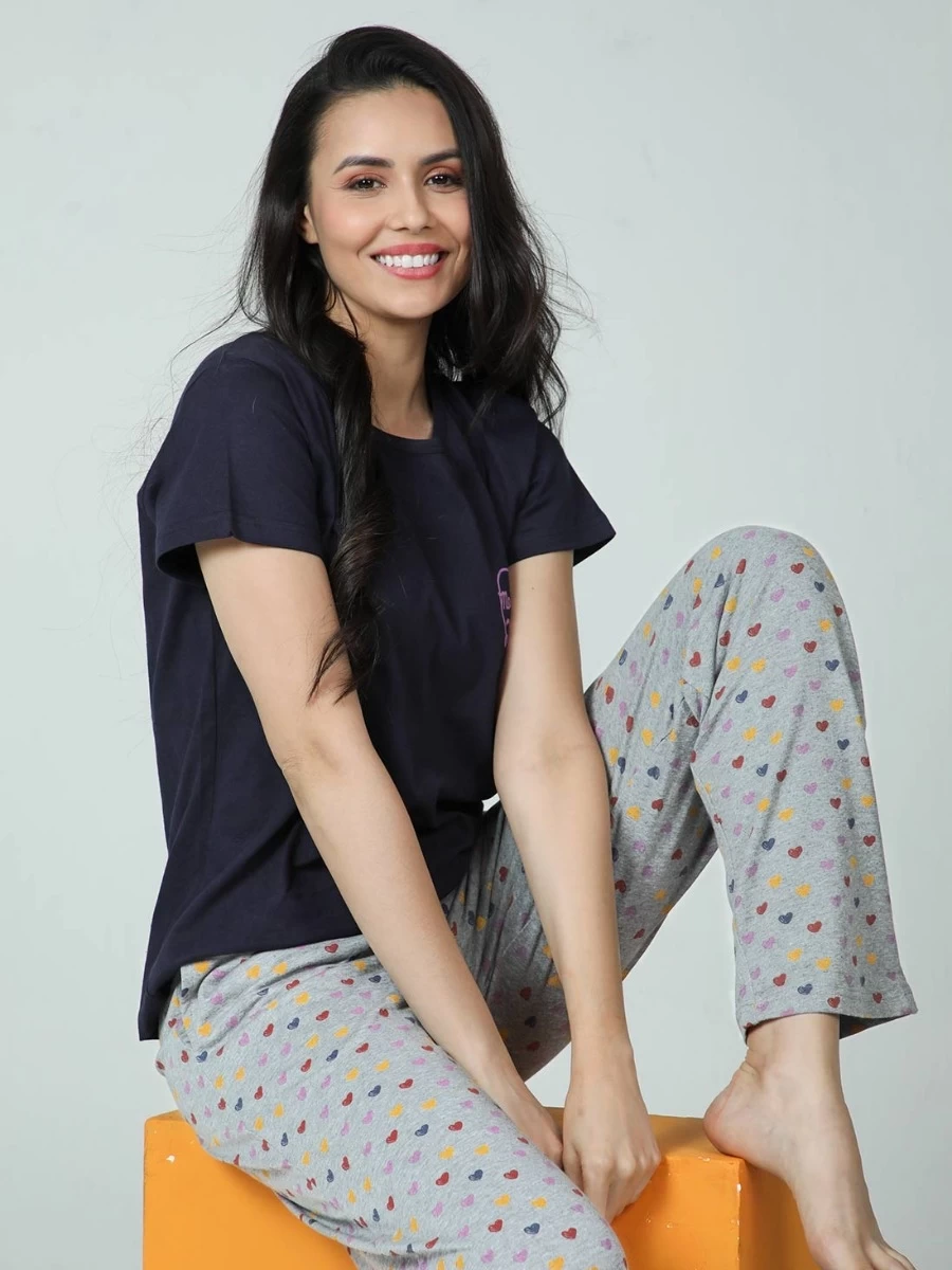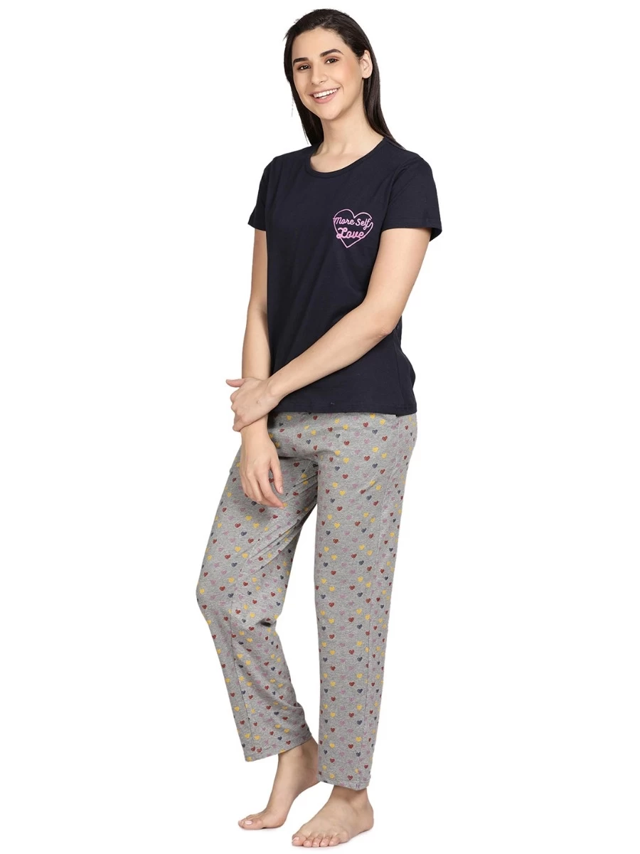 » Shyaway’s full-length grey colour pajamas with tiny heart prints.