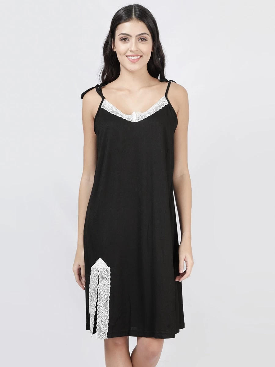 Susie Black Beauty Lace Front Slit Ribbed Chemise