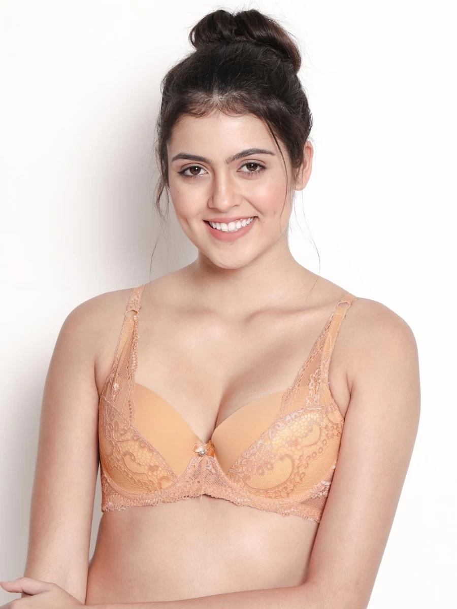 Susie Buff Skin Padded Wired Lace Strap Designer Plunge Bra