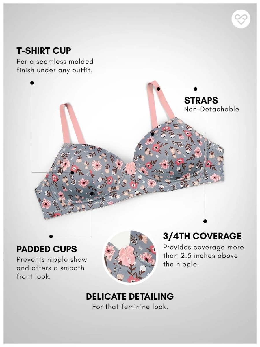 Taabu Monument Grey Floral Print Padded Wirefree T Shirt Bra